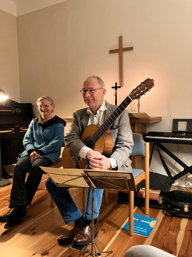 Im Anschluss gab es einen musikalischen Vortrag mit der Gitarre von Dino Dornis. Begleitet wurde die Musik durch Cordula Mertens von kurzen Lesungen, die sich mit Frieden und Mitmenschlichkeit beschäftigten. Die Texte waren einfach gehalten und luden zum Nachdenken ein – über das Zusammenleben, gegenseitigen Respekt und die Bedeutung von Menschlichkeit im Alltag.